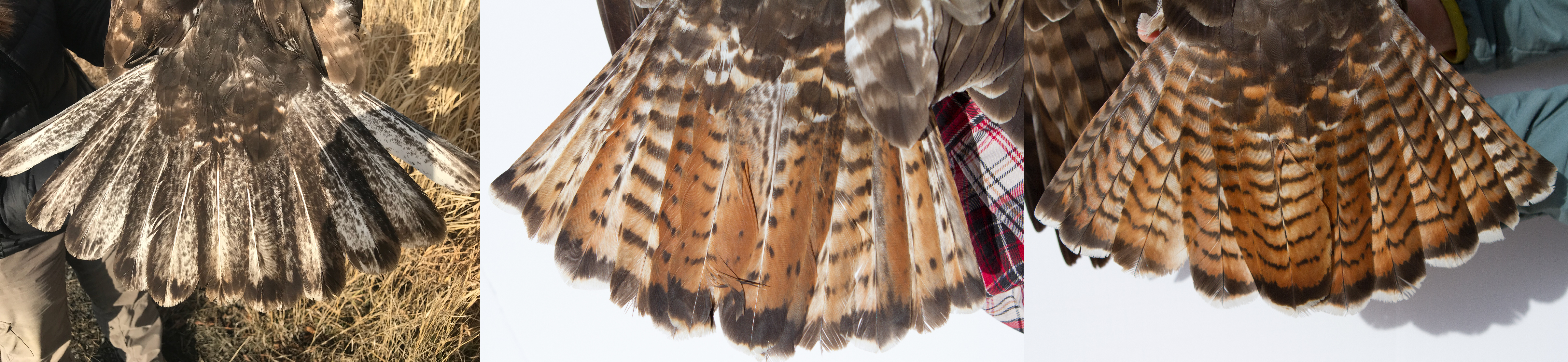 Below I’ve included a figure that compares a dark harlani (top) that I trapped with Neil Paprocki, Caitlin Davis, and Johnna Eilers in Northern Idaho in November 2019, the interesting intergrade (middle), and one of our transmitter birds (bottom). I also included photos of the tails of each to allow more detailed comparison between the three.